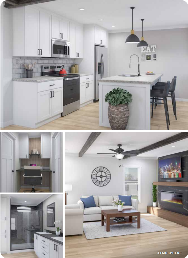 The Atmosphere-1318 is a three bedroom two bathroom home apart of the new Altitude line at Skyline Homes. This home is 1318 square feet and features interior features such as a built in home office desk.
